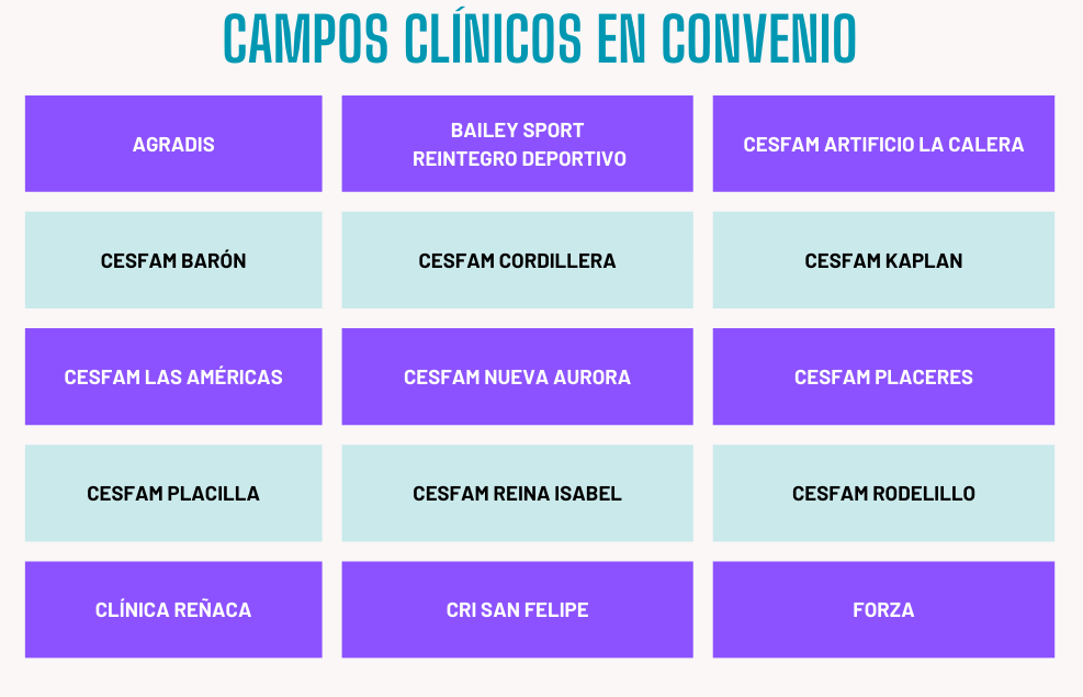 En forma adicional, cuenta con más de 20 convenios asistenciales – docentes con diversas instituciones de salud públicas y privadas a nivel nacional, así como también convenios internacionales que permiten llevar a cabo las actividades de Práctica Profesional de sus estudiantes de último año.