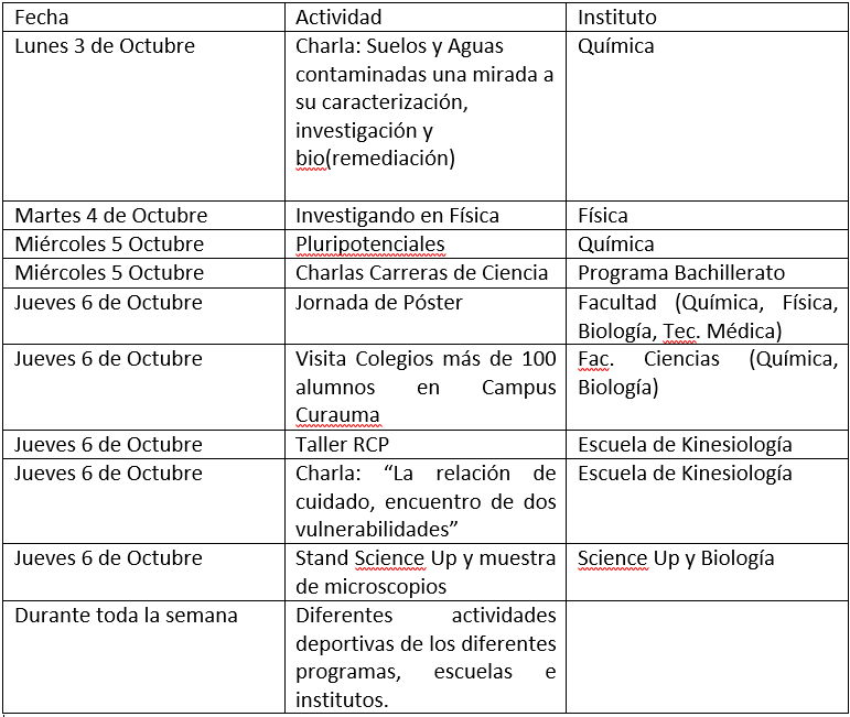 De forma paralela a la Semana de la Ciencia y la Tecnología que es impulsada principalmente por la Comisión Nacional de Investigación Científica y Tecnología (CONICYT), se celebraron actividades propias de los institutos que propiciaron un aire de festividad y camaradería en el Campus Curauma, con actividades deportivas y recreativas.