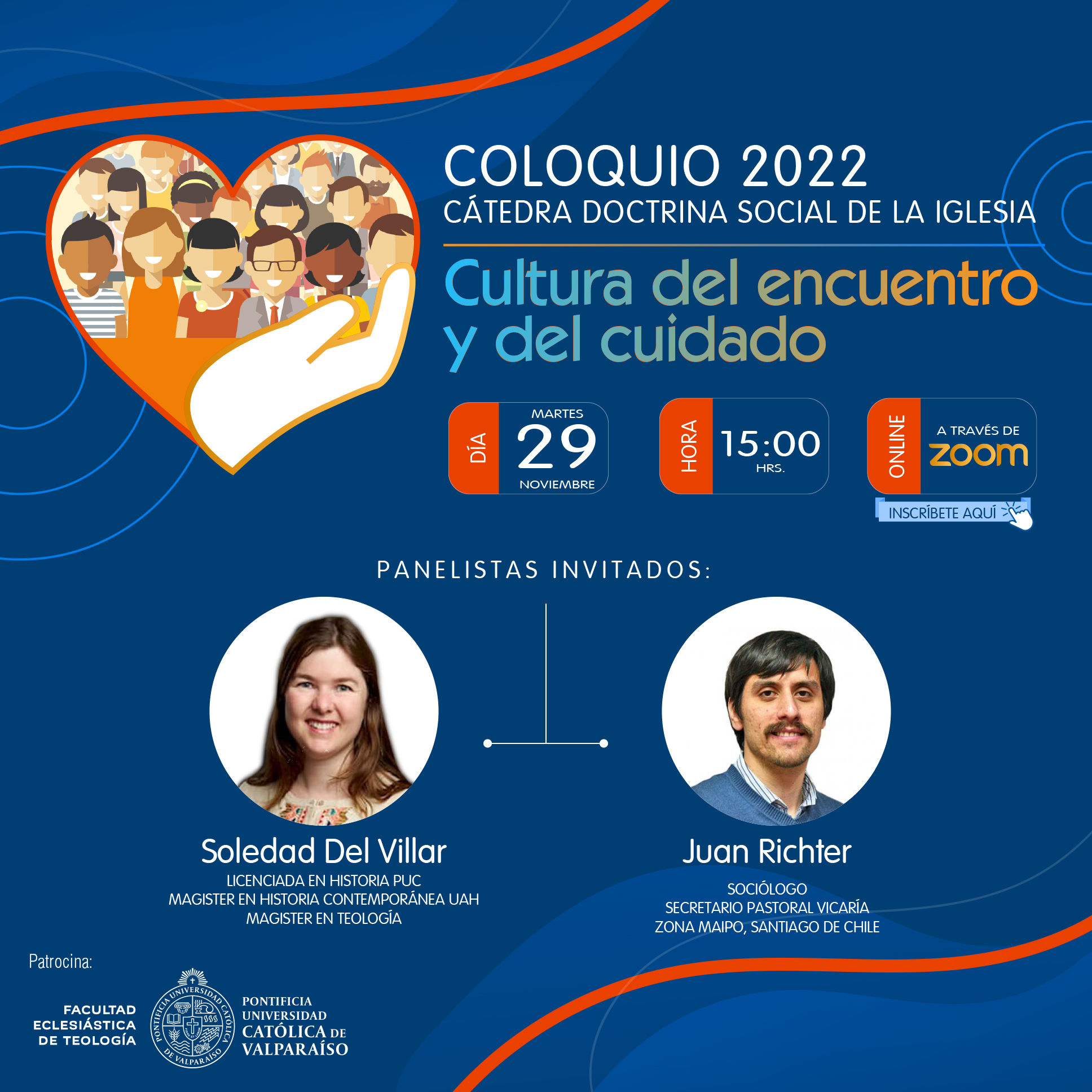 Con la participación de Soledad del Villar Tagle, licenciada en historia, magíster en historia Contemporánea UAH, magister en teología y doctoranda por la Universidad de Boston y Juan Richter, sociológo y secretario pastoral de la Vicaría Zona del Maipo en el Arzobispado de Santiago; el próximo martes 29 de noviembre a las 15.00 hrs. se llevará a cabo el coloquio 2022 de la Cátedra Doctrina Social de la Iglesia, titulado "Cultura del encuentro y del cuidado".