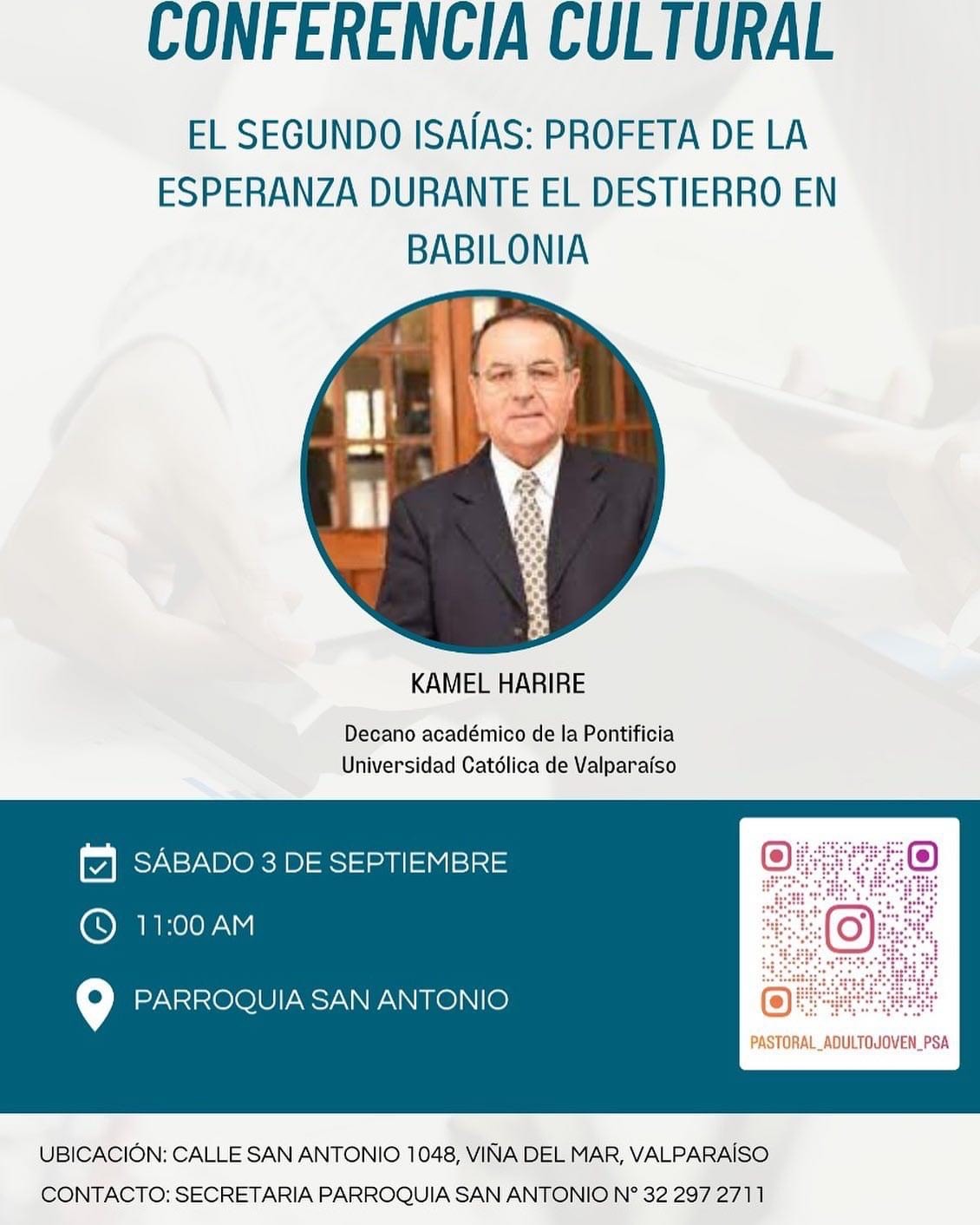 Este sábado 3 de septiembre, el profesor emérito de la Facultad Eclesiástica de Teología PUCV Dr. Kamel Harire S. dictará la conferencia cultural "El segundo Isaías: Profeta de la esperanza durante el destierro en Babilonia". La actividad es abierta a todo público y se llevará a cabo a partir de las 11.00 hrs en la Parroquia San Antonio, ubicada en calle San Antonio 1048 Viña del Mar.