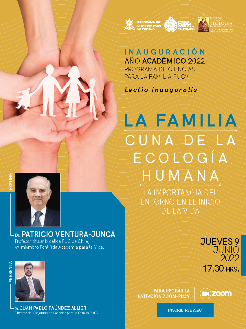 Con una lectio inauguralis a cargo del Dr. Patricio Ventura-Juncá, profesor titular de bioética en la Pontificia Universidad Católica de Chile, quien fue miembro de la Pontificia Academia por la Vida, el Programa de Ciencias para la Familia PUCV inaugurará su año académico 2022. "La familia, cuna de la ecología humana: la importancia del entorno en el inicio de la vida", es el nombre de la presentación que se realizará el próximo jueves 9 de junio a partir de las 17.30 hrs. a través de Zoom.