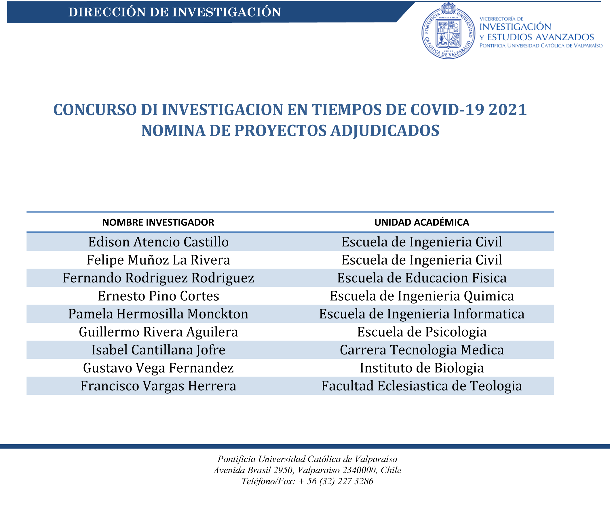 Usted está en: Portada | Vicerrectoría de Investigación, Creación e Innovación | Noticias FALLO CONCURSO DI INVESTIGACION EN TIEMPOS DE COVID-19 2021 Proyectos adjudicados: Twittear subir volver