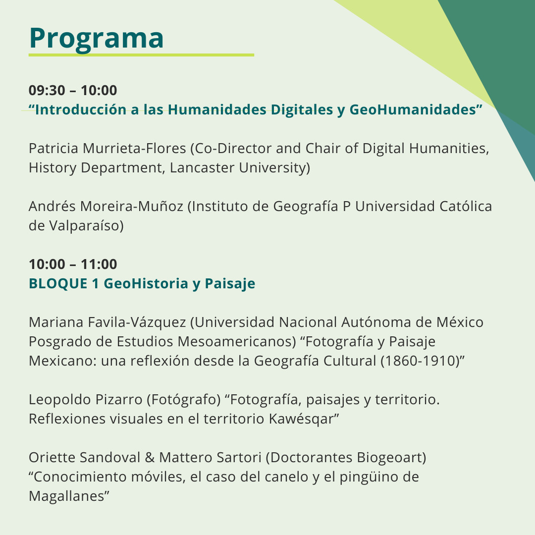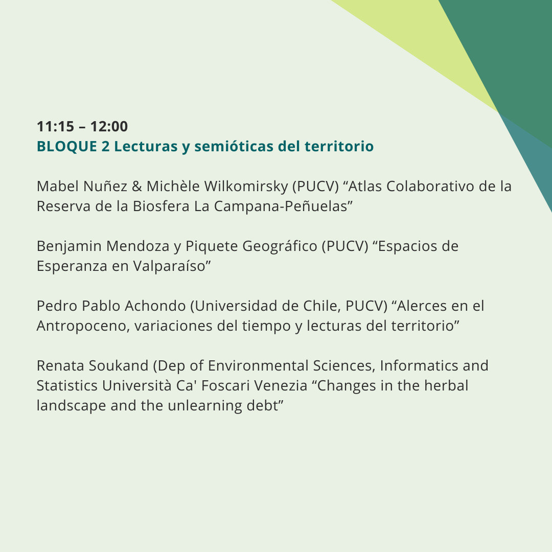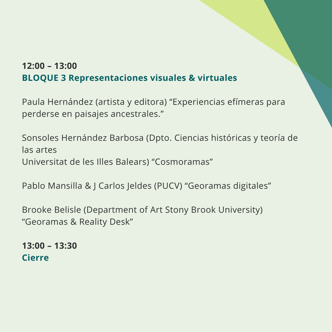 A partir de las 9.30 hrs y hasta las 13.30 hrs, esta instancia contará con 3 bloques de conversación, planteando un repaso introductorio al tema, para avanzar con miradas hacia la geohistoria, el territorio, sus paisajes; la lectura y semiótica de éste; así como sus representaciones visuales y virtuales.
