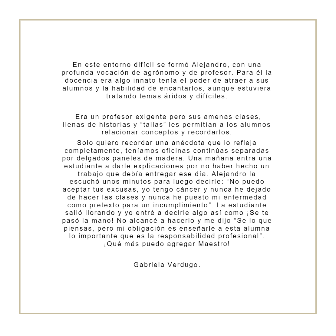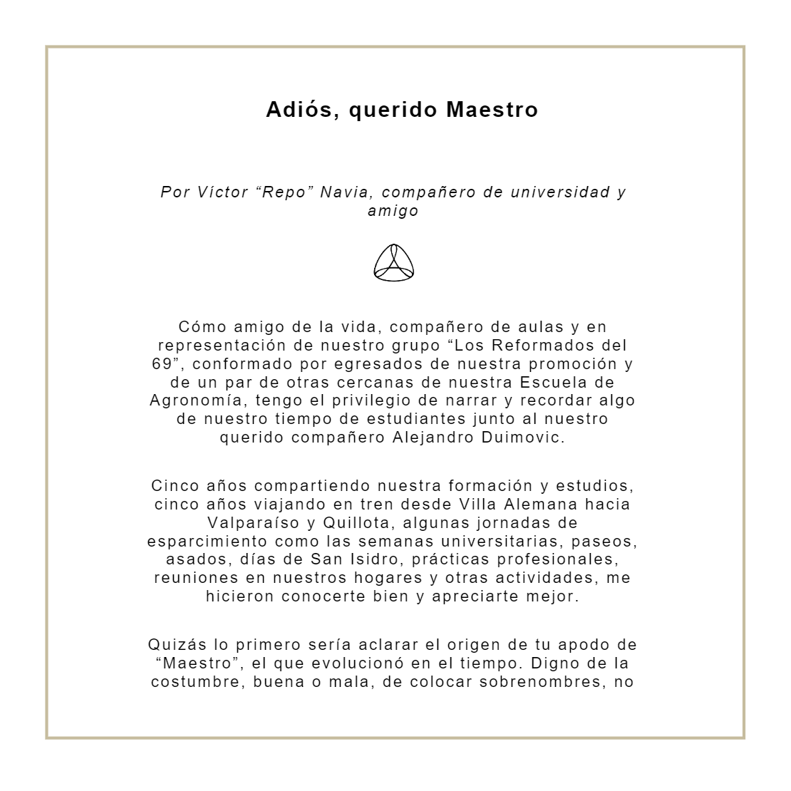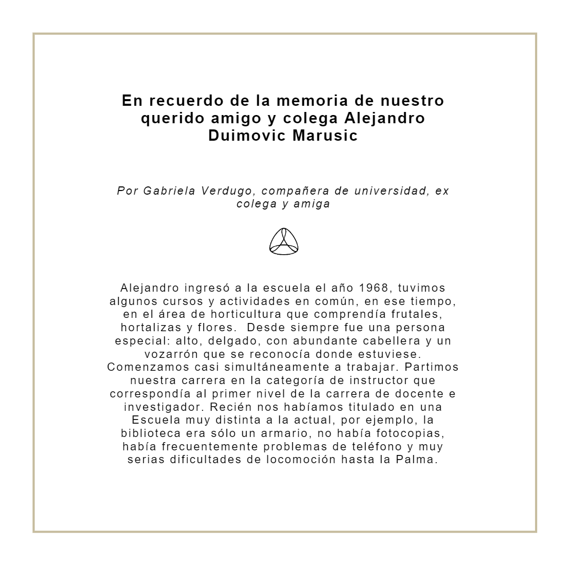 Con enorme pesar, el día 30 de diciembre de 2020 lamentamos comunicar el fallecimiento de quien fuera por muchos años académico de nuestra Escuela de Agronomía, Sr. Alejandro Duimovic Marusic (1949-2020).