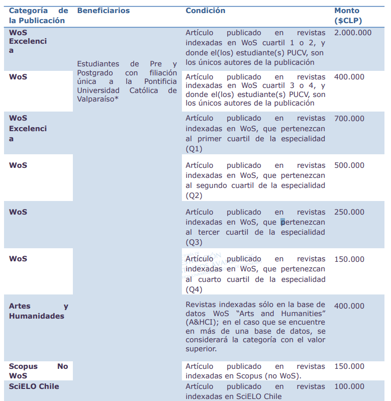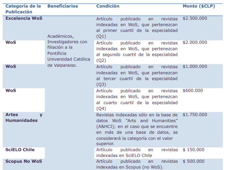 Nota: Considerado las publicaciones WoS, los incentivos aplican a las primeras 10 publicaciones durante el año calendario; las siguientes publicaciones en el año serán incentivadas de acuerdo al incentivo por WoS cuartil 4, exceptuando las publicaciones del cuartil 1 las que no se modificarán.