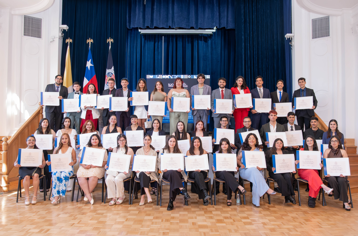 Posterior a ello, la Red Alumni, unidad encargada de potenciar el vínculo con los exalumnos, dio la bienvenida a este nuevo grupo de profesionales e hizo entrega del premio Alumni Generación 2024, otorgándole el galardón a Emilio Simón Bello Cristi, de la carrera de Pedagogía en Biología y Ciencias Naturales; y a Antonia Rafaela Naciff Rojas, del programa de Licenciatura en Biología.