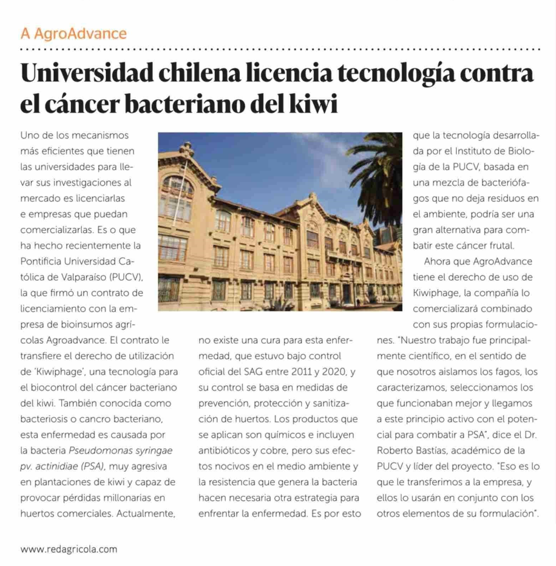 Usted está en: Portada | Instituto de Biología Tecnología para combatir cáncer bacteriano del kiwi es desarrollada en laboratorios del Instituto de Biología PUCV Dr. Roberto Bastías habla sobre licencia de principio activo con potencial para combatir a PSA (Pseudomonas syringae pv. actinidiae) Twittear subir volver