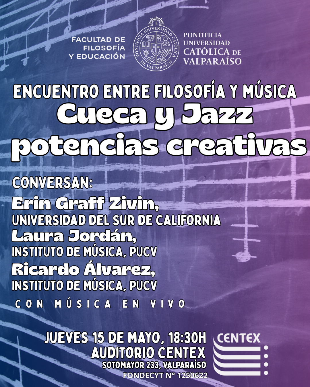 El Instituto de Filosofía de la Pontificia Universidad Católica de Valparaíso, en conjunto con la Facultad de Filosofía y Educación y el Instituto de Música, invita cordialmente al evento “Encuentro entre filosofía y música: cueca y jazz, potencias creativas”, que se llevará a cabo el próximo 15 de mayo en el auditorio del CENTEX, ubicado en la Plaza Sotomayor, Valparaíso.