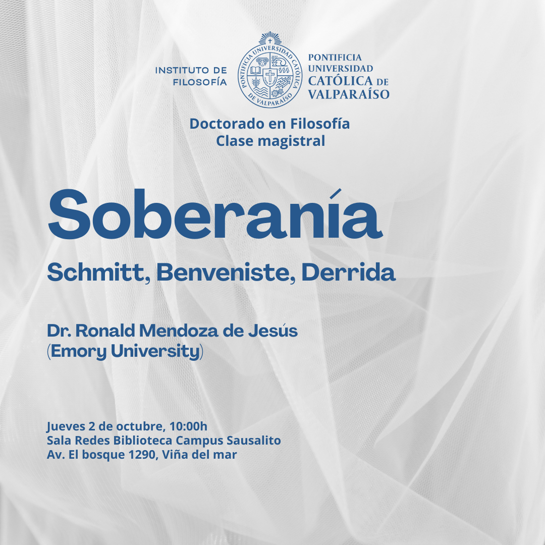 Jueves 2 de octubre, 10:00h-12:30h. El problema de la soberanía. Schmitt, Benveniste, Derrida. En el marco de sus investigaciones, el profesor Mendoza presenta algunas reflexiones y lecturas en el cruce entre grandes pensadores contemporáneos de la soberanía. Sala Redes (av. El bosque 1290, Viña del Mar).