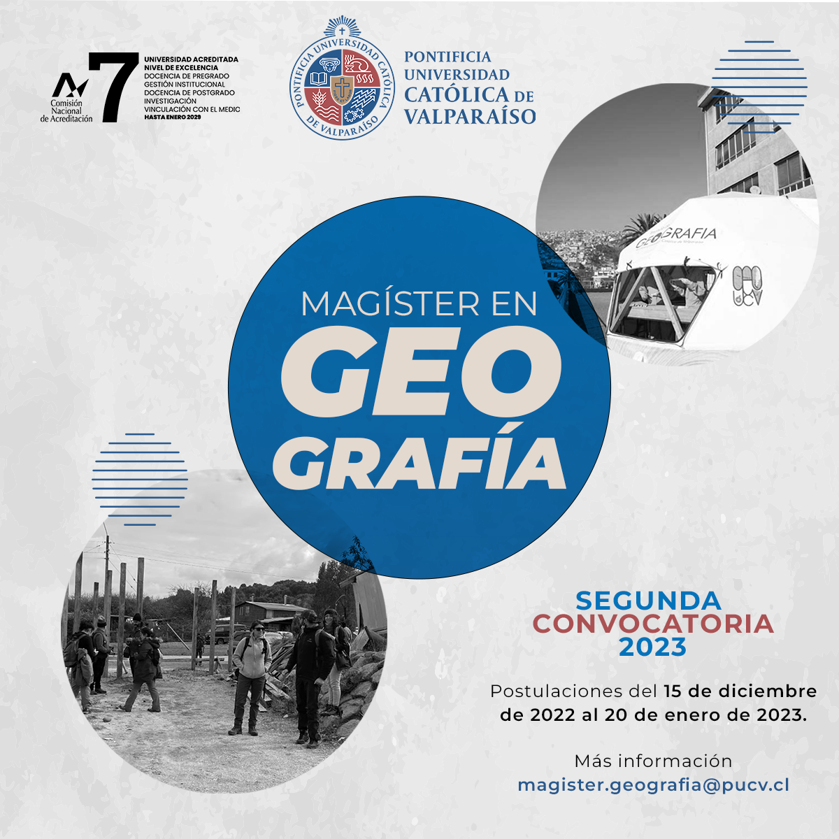 Este jueves 15 de diciembre se darán inicio a las postulaciones en línea para la segunda versión del Magíster en Geografía, impartido por el Instituto de Geografía de la Pontificia Universidad Católica de Valparaíso. El programa de estudios, establecido en la formación de postgrado, se efectuará en modalidad presencial a partir de marzo en las dependencias del edificio Isabel Caces Brown.