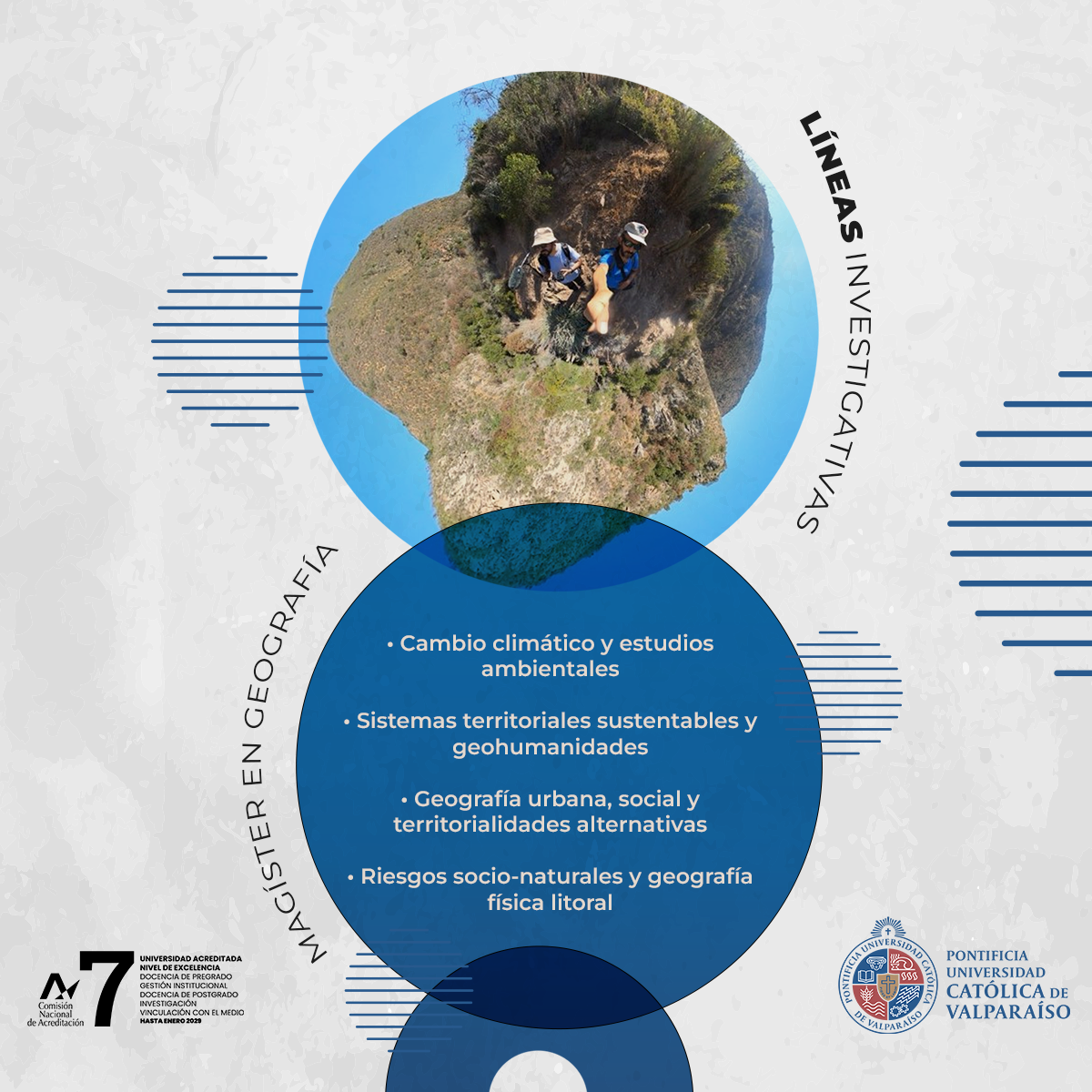 De esta manera, el Magíster en Geografía se consolida con sus actuales cuatro líneas de investigación: Cambio climático y Estudios ambientales; Sistemas territoriales sustentables y Geohumanidades; Geografía urbana, social y territorialidades alternativas; y Riesgos socio-naturales y Geografía Física Litoral.