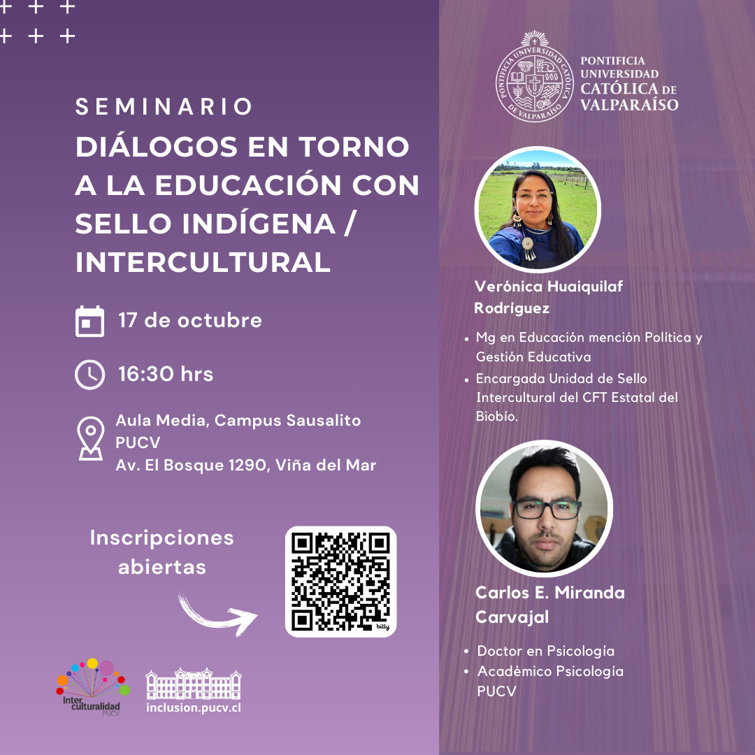 La Pontificia Universidad Católica de Valparaíso, por medio de la Vicerrectoría de Vinculación con el Medio y su Programa de Interculturalidad de la Dirección de Inclusión, llevarán a cabo el Seminario "Diálogos en torno a la educación con sello indígena/ intercultural", un espacio en donde expondrá el Dr. Carlos Miranda Carvajal, docente de la Escuela de Psicología, y Verónica Huaiquilaf Rodríguez, encargada de Unidad de sello intercultural del CFT Estatal del Biobío, quienes expondrán desde sus saberes y experiencias, en torno a la comprensión de la interculturalidad, considerando el camino hacia una educación con sello indígena/ intercultural.