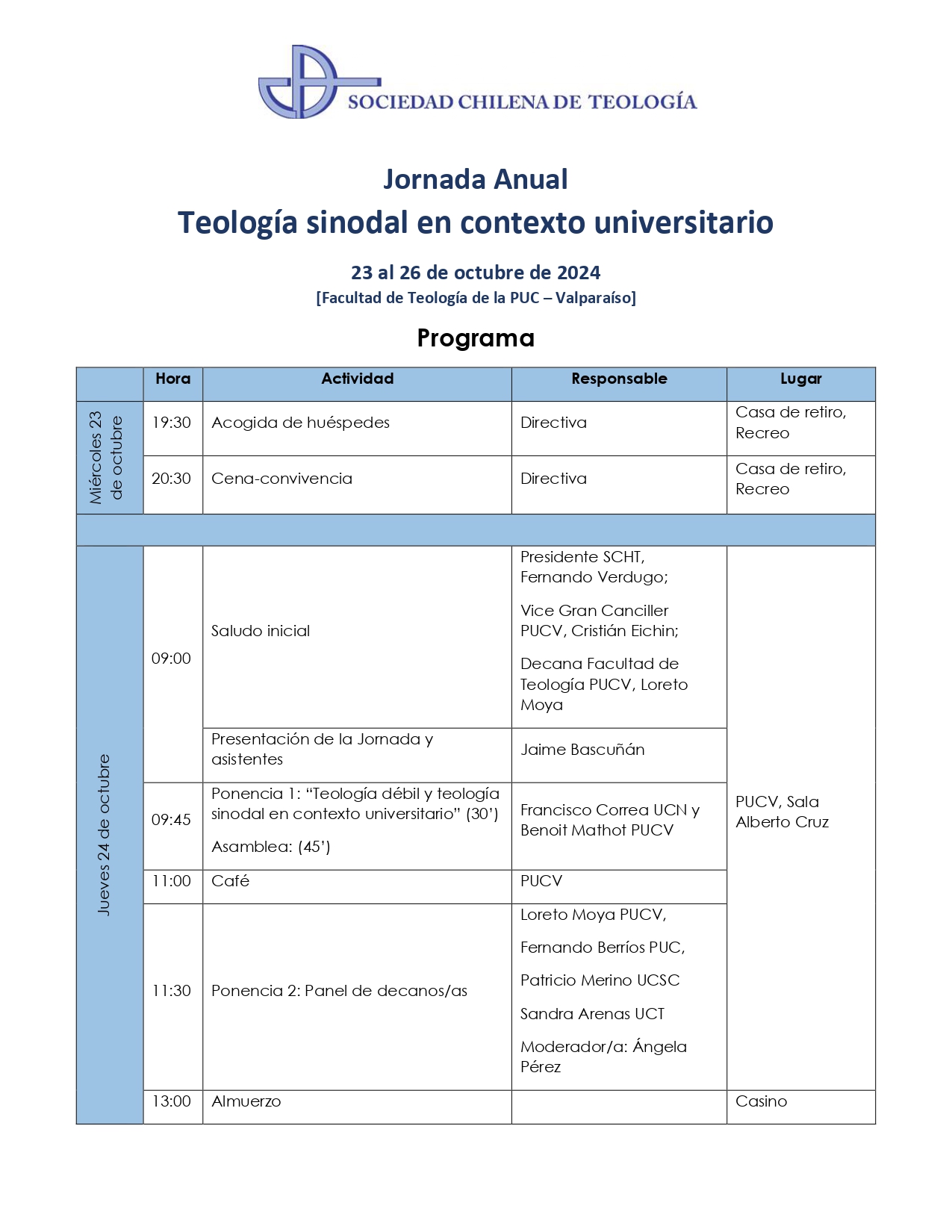 De acuerdo a lo informado por la organización, esta versión 2024 está dedicada a la "Teología sinodal en contexto universitario", contando en su jornada inaugural con la presencia del presidente de la SCHT, Fernando Verdugo; del Vice Gran Canciller de la PUCV, Cristián Eichin; y de la Decana de la Facultad de Teología de la PUCV, Dra. Loreto Moya, quien dio la bienvenida al encuentro en nombre de la Universidad.