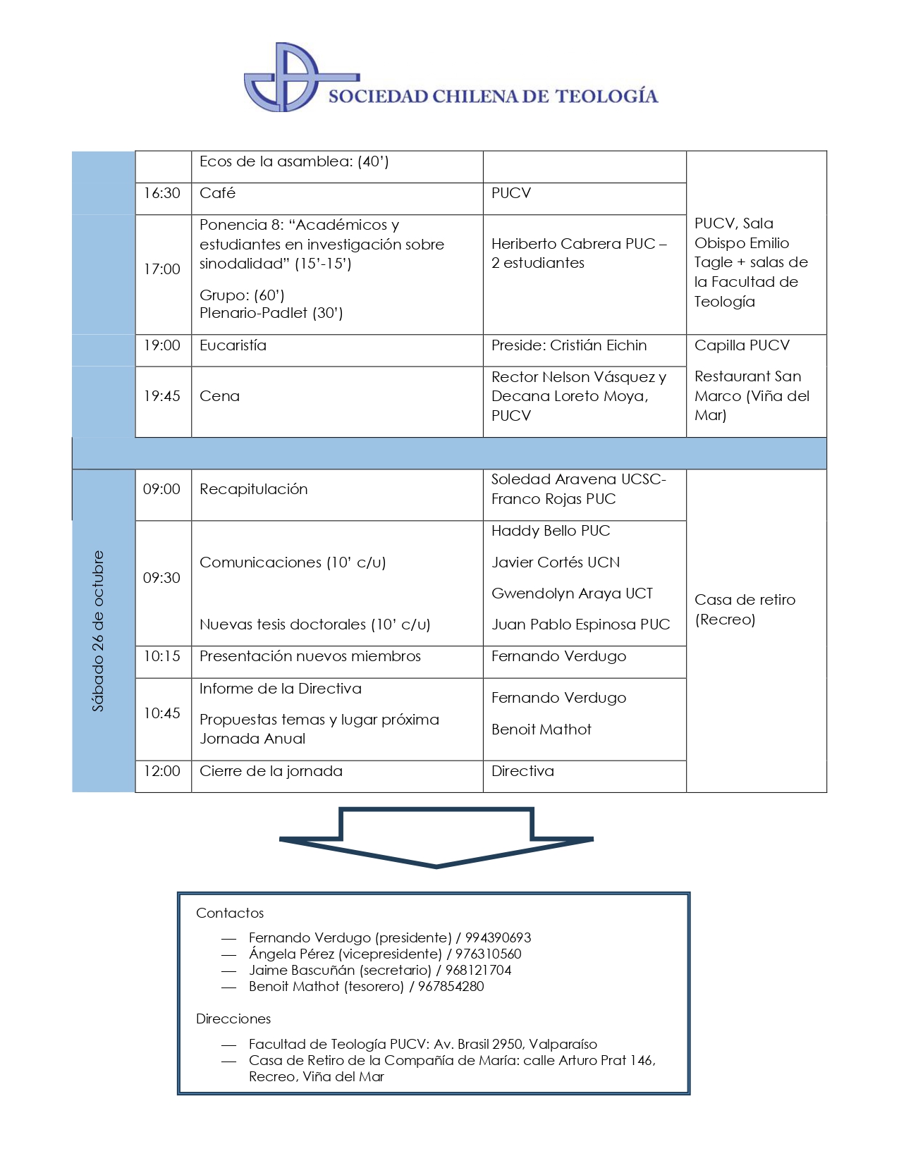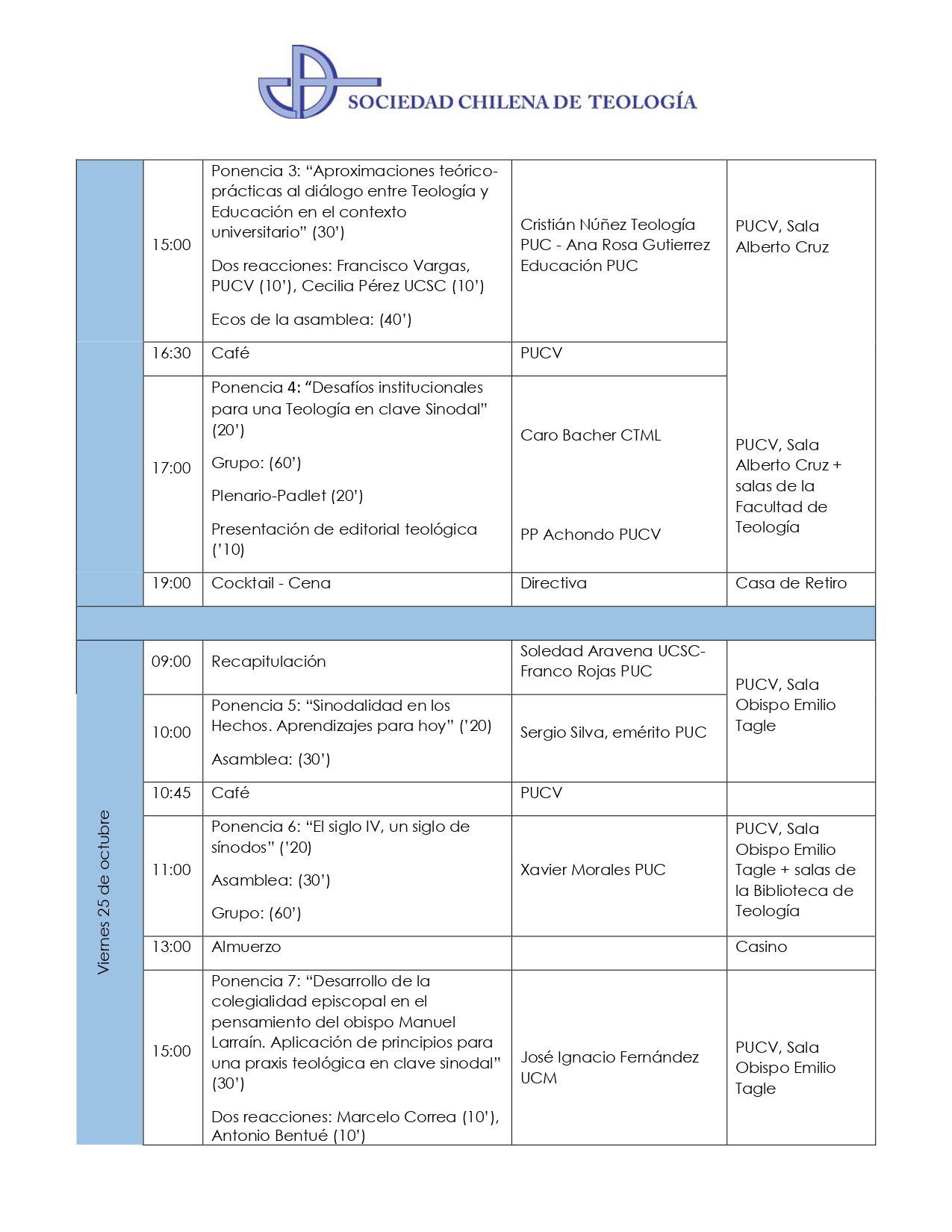 Algunas de las ponencias programadas en esta nueva Jornada Anual de la Sociedad Chilena de Teología son "Teología débil y teología sinodal en contexto universitario", a cargo de los profesores Benoit Mathot (PUCV) y Francisco Correa (UCN); "Aproximaciones teórico-prácticas al diálogo entre Teología y Educación", realizada por los académicos Cristián Núñez (Teología PUC) y Ana Rosa Gutiérrez (Educación PUC); y "Desafíos institucionales para una Teología en clave Sinodal", a cargo de Caro Bacher (CTML).