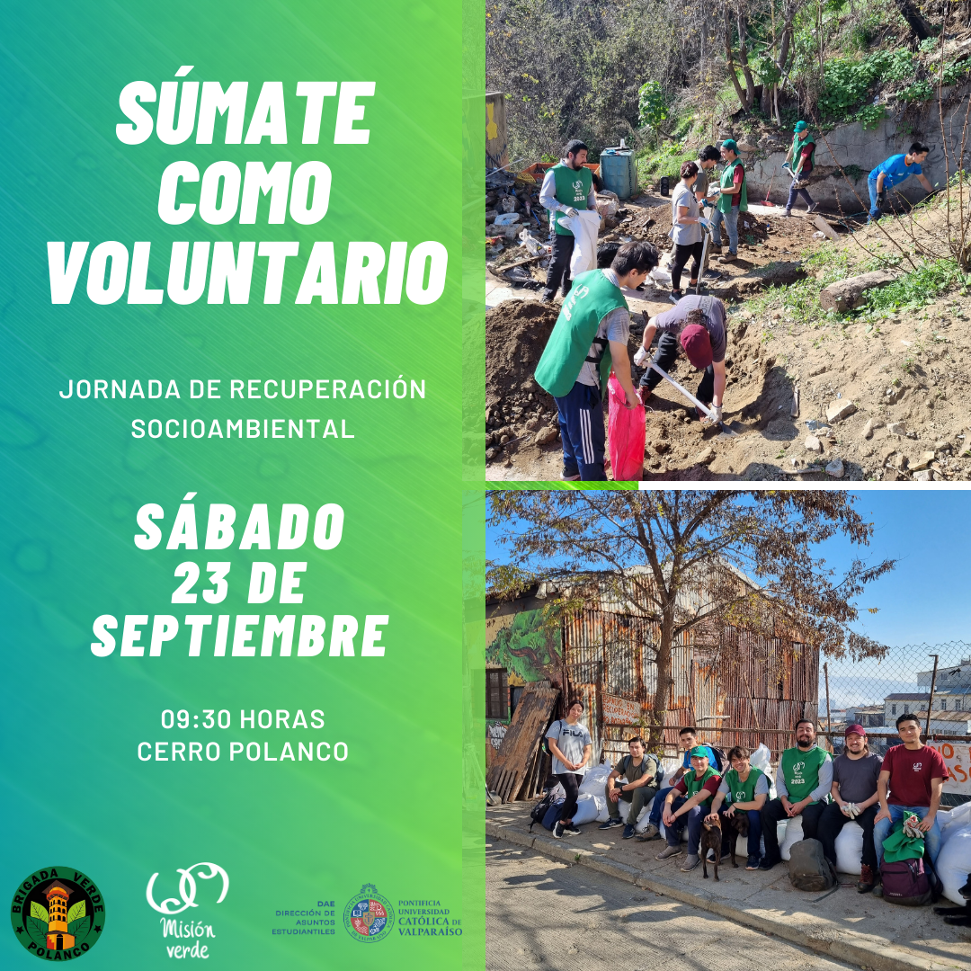Súmate como voluntario a una nueva jornada de limpieza del micro basural ubicado a un costado de la junta de vecinos del Cerro Polanco. Nos reuniremos a las 9:30 horas el día sábado 23 de septiembre en la Casa Central para dirigirnos al Cerro Polanco y trabajar en la remoción de escombros en conjunto con los vecinos del sector.
