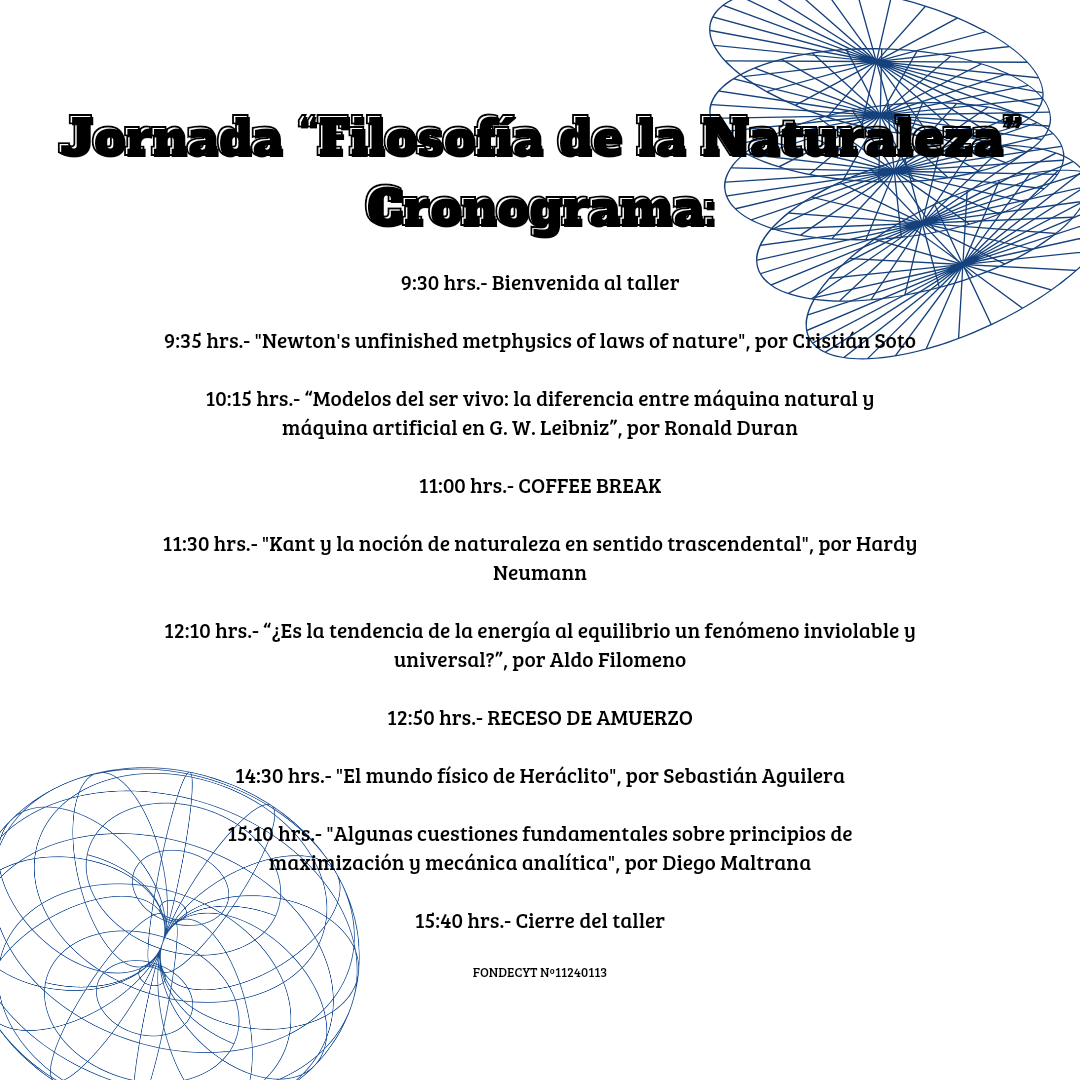 El encuentro comenzará a las 9:30 con una bienvenida al taller, seguido de una exposición de Cristian Soto sobre la "Metafísica inacabada de las leyes de la naturaleza en Newton", a las 9:35. A las 10:15, Ronald Durán abordará las diferencias entre "Máquinas naturales y artificiales" en la obra de Leibniz.