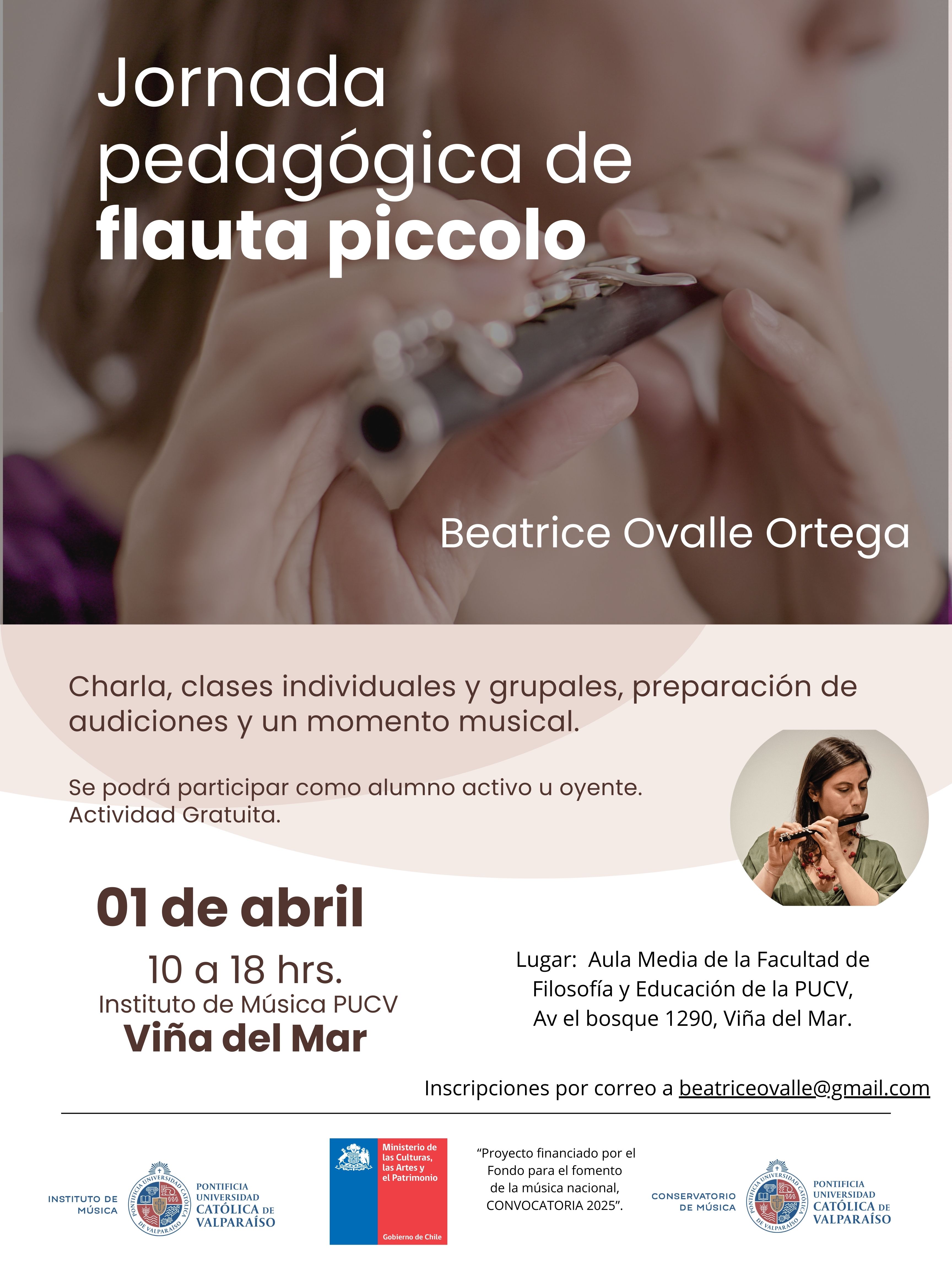 Te invitamos a una jornada imperdible con Beatrice Ovalle Ortega, donde podrás disfrutar de charlas, clases magistrales individuales y grupales, preparación de audiciones y un productivo momento musical.