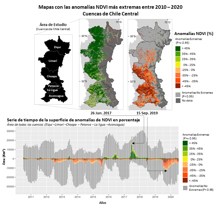 Esta metodología ha sido aplicada profusamente en Chile: el Lab GRS ha evaluado el comportamiento histórico de la vegetación de Bofedales Altoandinos y su relación con el clima; los efectos de la megasequía en Chile Central, incluyendo el follaje verde en el Parque La Campana –que a 2019 registró el menor en dos décadas–, los daños de la "tormenta de fuego" de Constitución en 2017; las irrupciones masivas de insectos, tales como polillas o cuncunas, que afectan más frecuentemente cientos de hectáreas de bosques patagónicos en Aysén; y patrones de disminución de nieve en el volcán Mocho-Choshuenco, entre otros fenómenos naturales recientes.