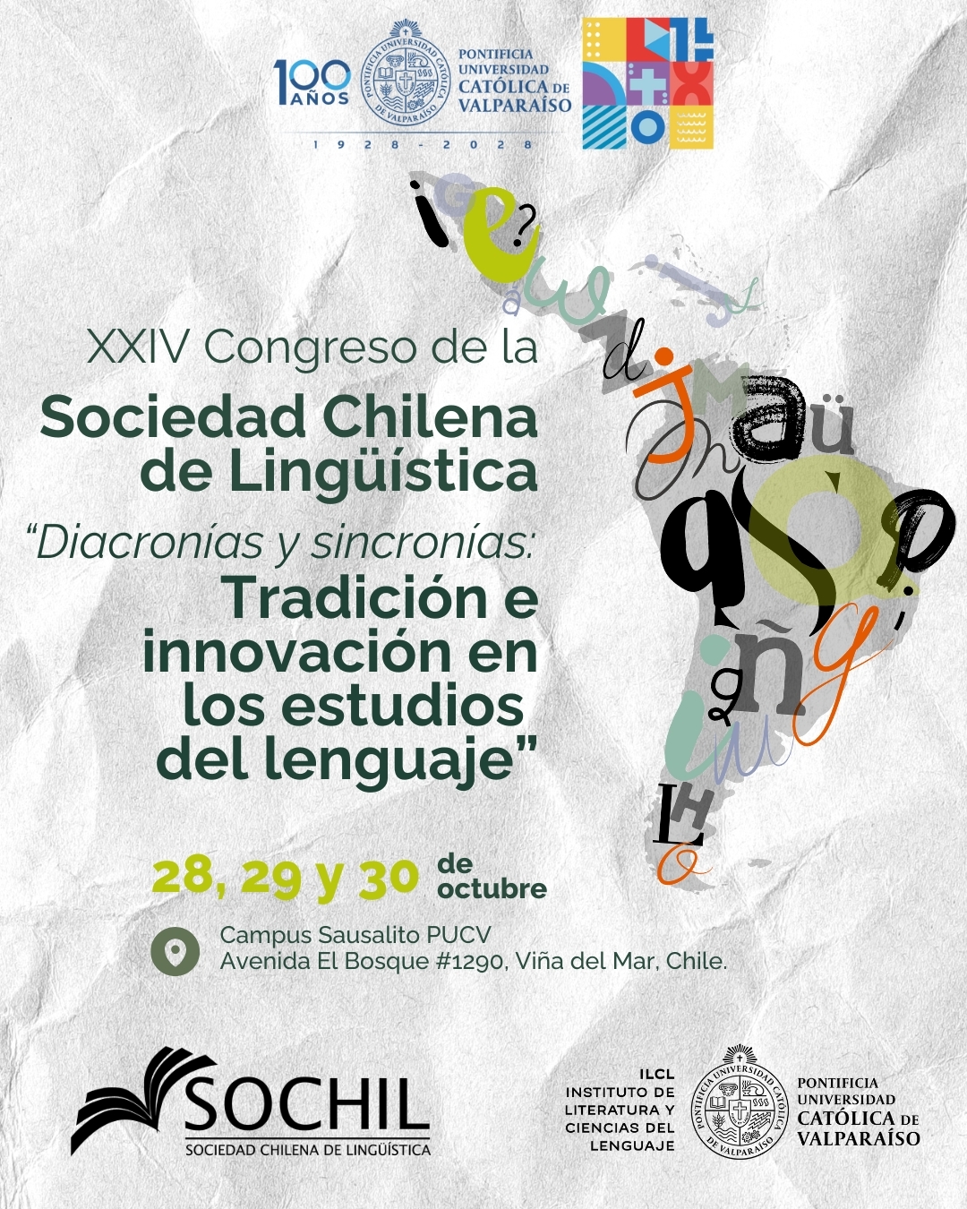 Durante los días 28, 29 y 30 de octubre se llevará a cabo en Viña del Mar el XXIV Congreso de la Sociedad Chilena de Lingüística (SOCHIL) “Diacronías y sincronías: tradición e innovación en los estudios del lenguaje”, organizado por el Instituto de Literatura y Ciencias del Lenguaje (ILCL) de la Pontificia Universidad Católica de Valparaíso.