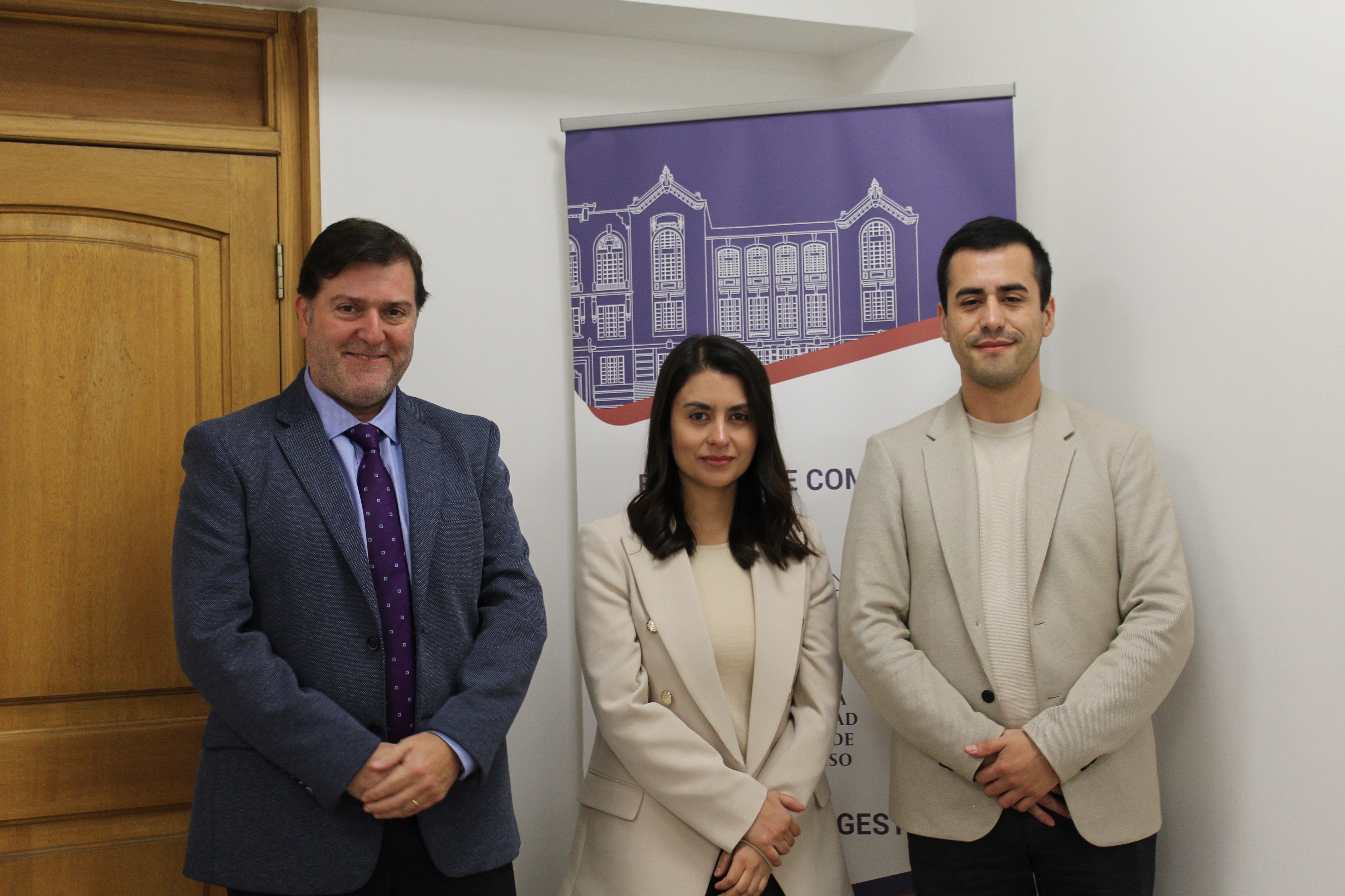 Los encargados de llevar esta gestión adelante y quienes estuvieron presentes en la reunión. Por un lado, el magistrado de TTA Valparaíso, Marcelo Valdovinos junto a Catalina Cornejo, resolutora de la organización. Por otro lado, el director de Magíster en Gestión de la Escuela de Comercio, Mario Pino y la asistente de Postgrado, Ivette Valdivia.