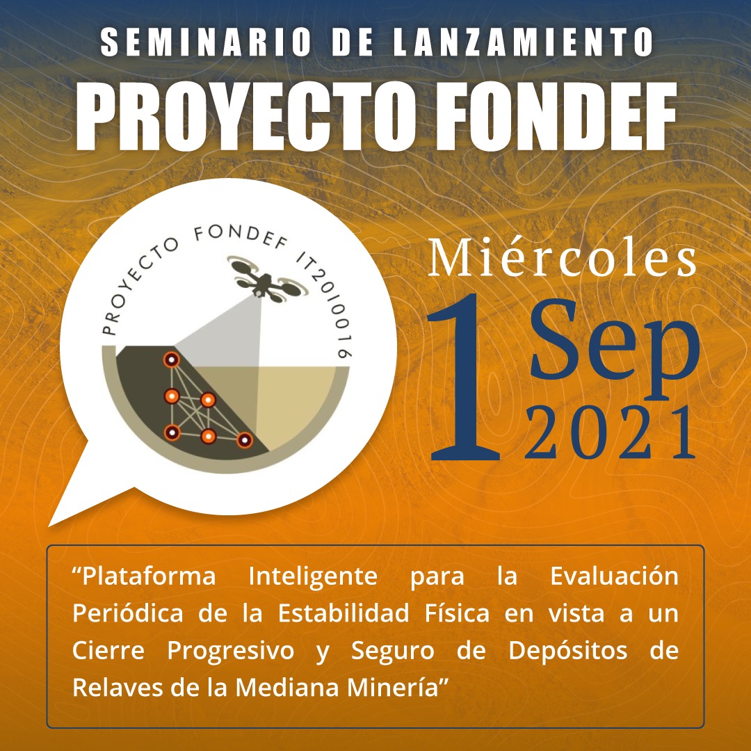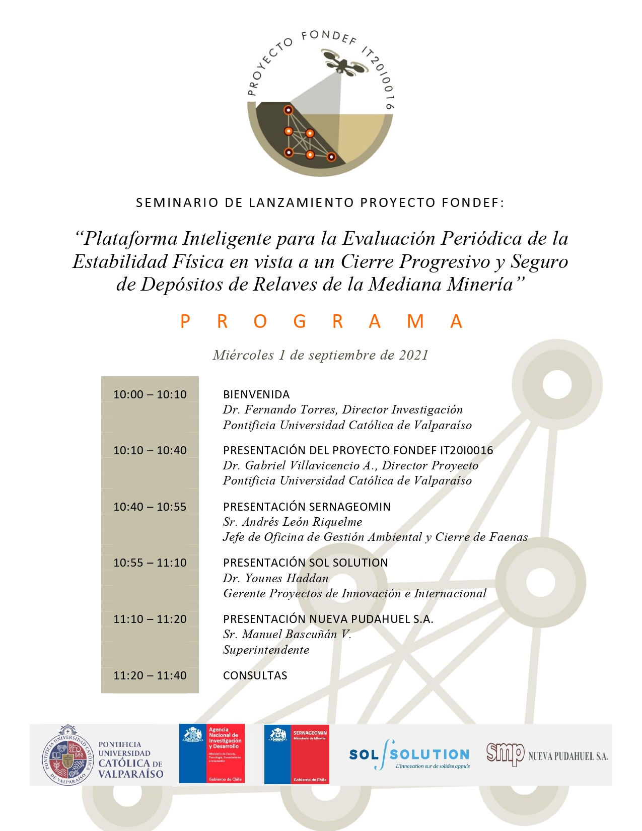 Usted está en: Portada | Escuela de Ingeniería en Construcción | Eventos "Plataforma inteligente para la evaluación periódica de la estabilidad física en vista a un cierre progresivo y seguro de depósitos de Relaves de la Mediana Minería" Seminario de Lanzamiento Proyecto Fondef Twittear subir volver