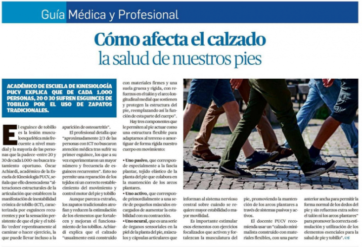 El pasado Domingo 03 de Octubre del 2021, el profesor Oscar Achiardi participa de un reportaje en la Guía Médica y Profesional del Diario El Mercurio de Valparaíso, donde da a conocer los efectos de no acudir a rehabilitación temprana cuando se presenta un esguince de tobillo y además entrega una serie de recomendaciones sobre el uso de un calzado adecuado.