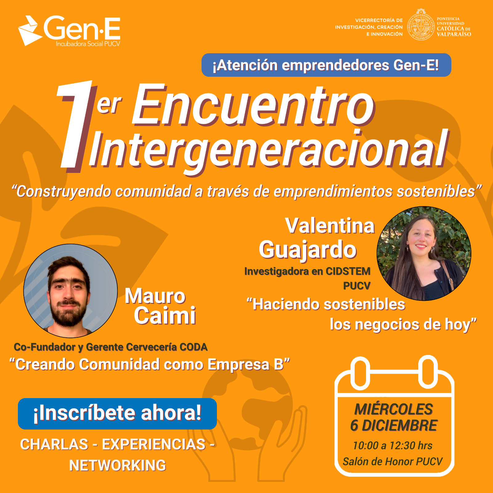 La Incubadora Social de la Pontificia Universidad Católica de Valparaíso, Gen-E, invita a todos sus ex participantes y actuales incubados para que se sumen al Primer Encuentro de Emprendedores Intergeneracional Gen-E, titulado "Construyendo comunidad a través de emprendimientos sostenibles".