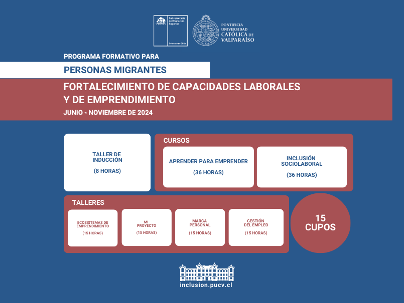Además de la inducción a la PUCV, se realizarán cursos para aprender a emprender, desde la toma de conocimiento del ecosistema de emprendimiento, a la formulación de proyectos y marcas propias, y también talleres relativos a la inclusión sociolaboral y gestión del empleo. Las clases se impartirán en jornada diurna, de 09.30 a 13.30 horas, dos días a la semana. Hay 15 cupos disponibles.