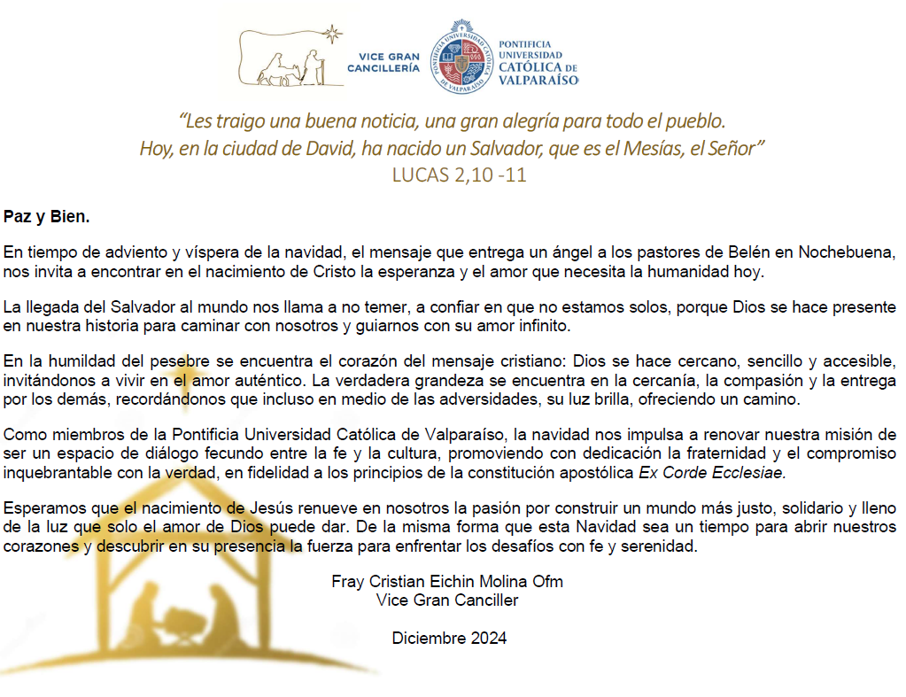 Usted está en: Portada | Vice Gran Cancillería | Noticias Identidad Católica de la PUCV Saludo de Navidad Vice Gran Canciller Fray Cristian Eichin Molina OFM Twittear subir volver