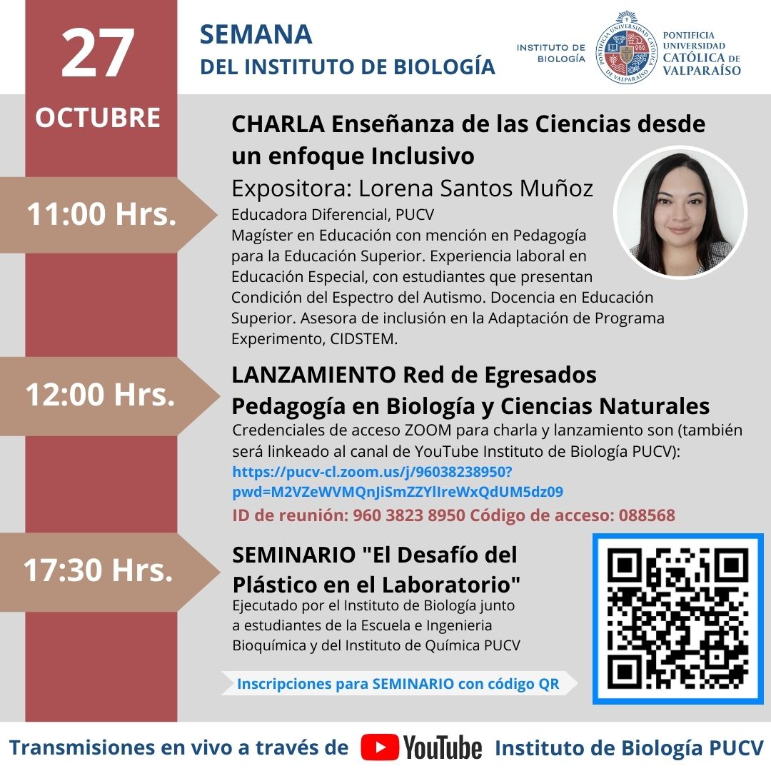 Con charla de Enseñanza de las Ciencias desde un enfoque Inclusivo; lanzamiento de Red de Egresados Pedagogía en Biología y Ciencias Naturales y seminario "El Desafío del Plástico en el Laboratorio", el Instituto de Biología ha organizado, para este miércoles 27 de octubre, una serie de actividades en el marco de la Semana del Instituto de Biología PUCV.