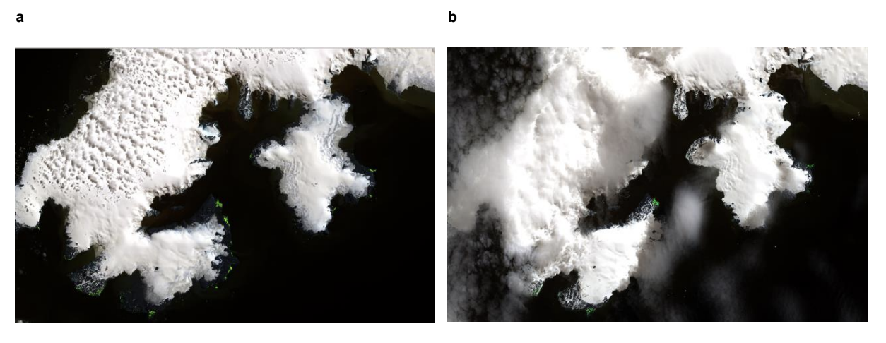 Las dos imágenes observadas satelitalmente. La imagen a corresponde al 2019 y la imagen b al 2021.