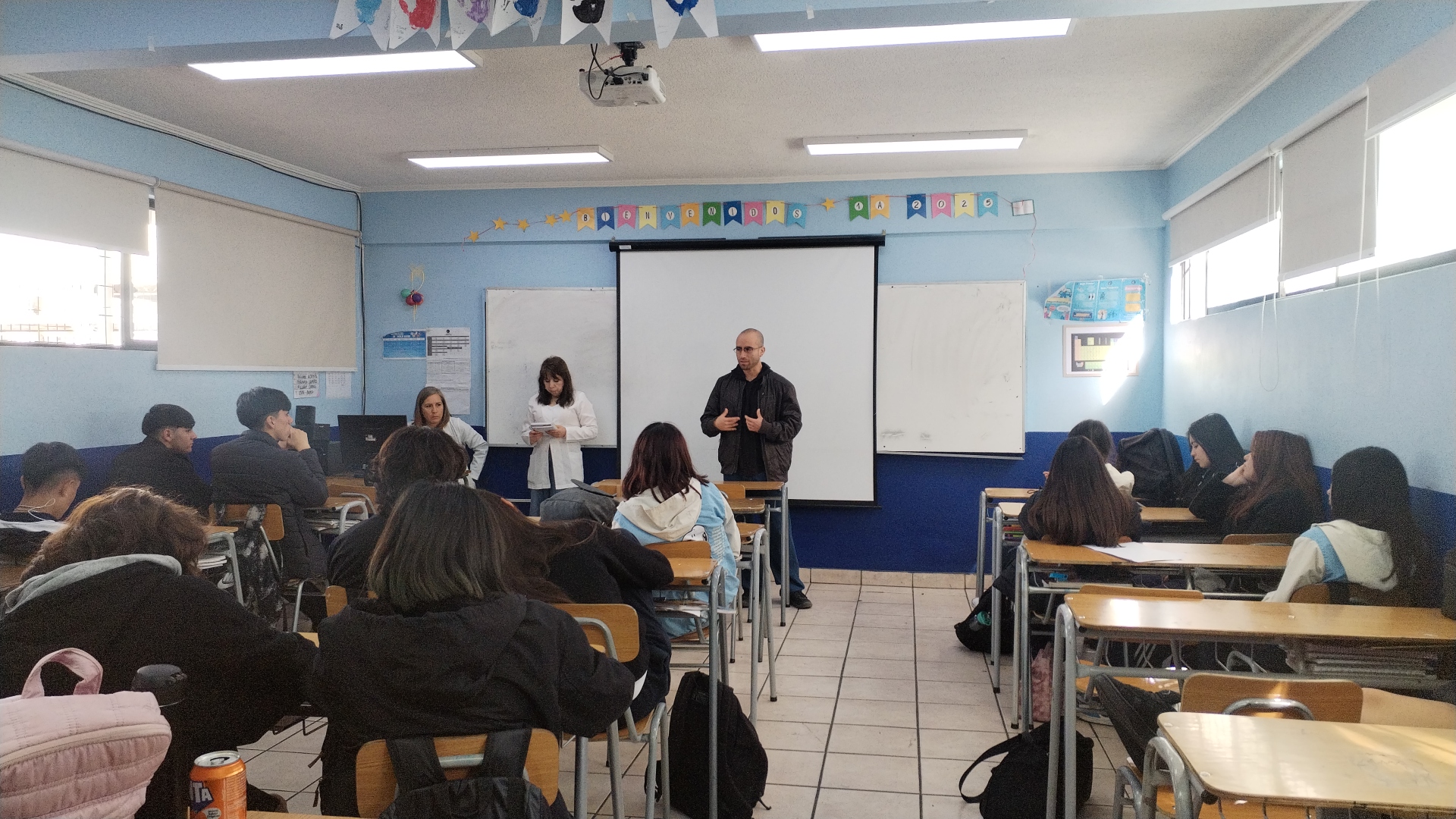 Participaron estudiantes de cuarto medio, la profesora de arte del liceo —invitada especialmente para esta ocasión— y docentes de distintas áreas, entre ellos José Moraga y David Jeria, ambos egresados del Instituto de Filosofía de la Pontificia Universidad Católica de Valparaíso.