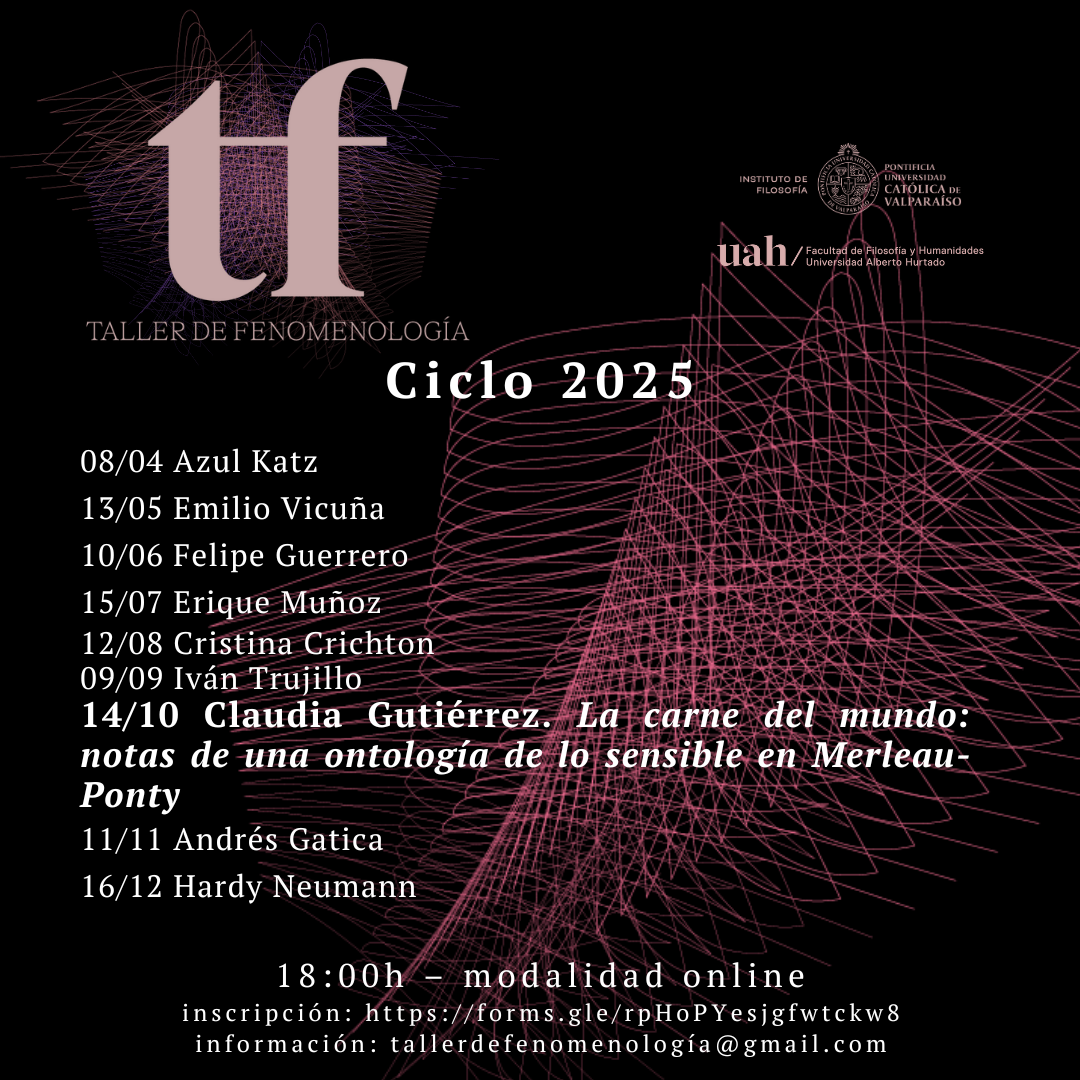 El Taller de Fenomenología continúa su ciclo 2025 con su séptima sesión. Este se realizará el día martes 14 de octubre a las 18h a través de Zoom. En esta ocasión, el taller está a cargo de la prof. Dra. Claudia Gutiérrez, profesora de la Universidad de Chile, con la conferencia La carne del mundo: notas de una ontología de lo sensible en Merlau-Ponty. Como siempre, las inscripciones se realizan a través del siguiente link: https://forms.gle/
