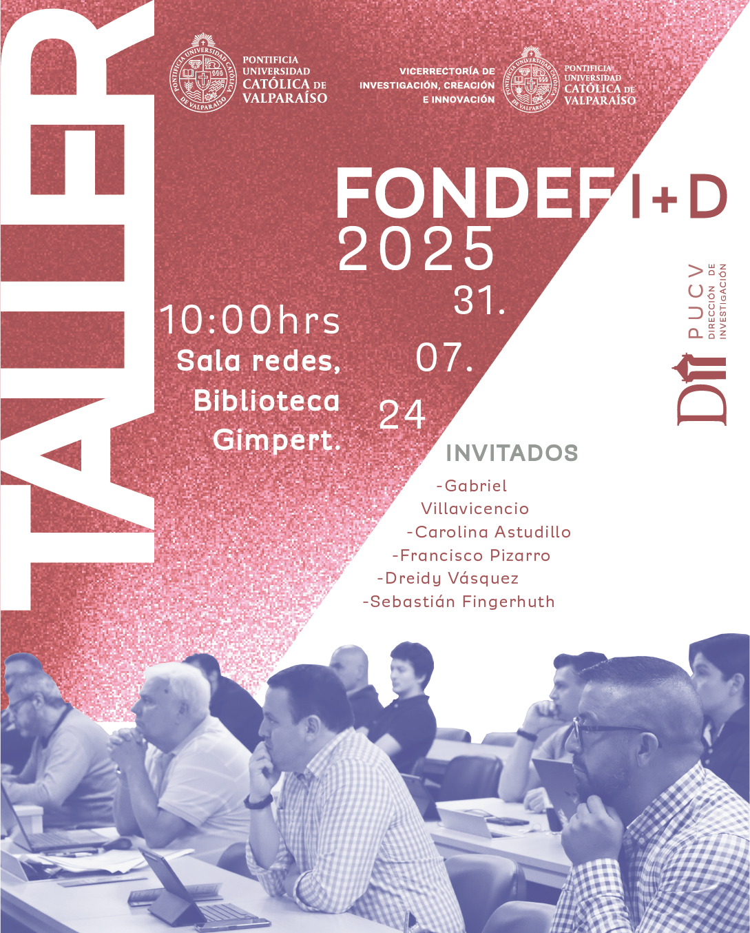 La Dirección de Investigación de la PUCV les invita al taller informativo Fondef I+D 2025, cuyo objetivo es compartir experiencias de otros investigadores de la PUCV que ya han adjudicado un FONDEF, y presentar las principales características del Concurso.