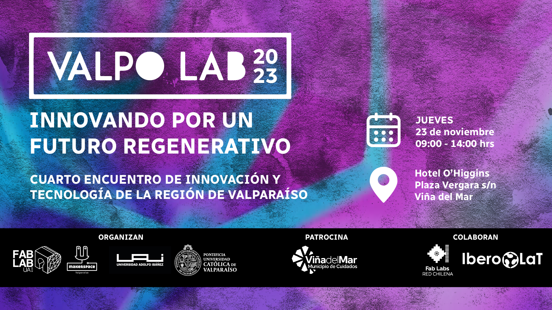 La Dirección de Innovación de la Pontificia Universidad Católica de Valparaíso, tiene el agrado de invitarlos al evento titulado "ValpoLab 2023: Innovando por un futuro regenerativo", que se realizará este jueves 23 de noviembre desde las 9:00 hrs en las dependencias del Hotel O'Higgins, Plaza Vergara s/n Viña del Mar.