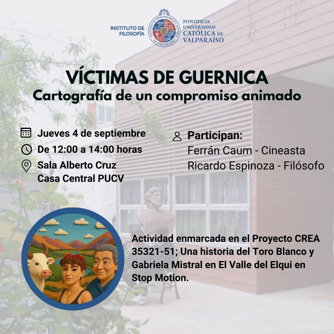 El Instituto de Filosofía PUCV invita a la actividad “Víctimas de Guernica, cartografía de un compromiso animado”, que se realizará el jueves 4 de septiembre a las 12:00 horas en la Sala Alberto Cruz de Casa Central.