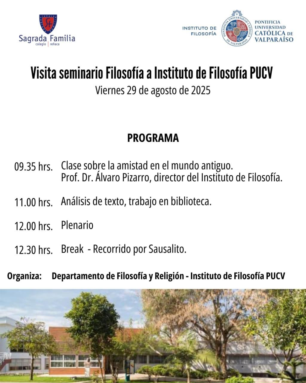 La jornada comenzará a las 09:35 hrs. con la clase “La amistad en el mundo antiguo”, a cargo del Prof. Dr. Álvaro Pizarro, director del Instituto de Filosofía. A las 11:00 hrs. se realizará un análisis de texto y trabajo en biblioteca, seguido a las 12:00 hrs. por un plenario. Para finalizar, a las 12:30 hrs. está contemplado un break y recorrido por el Campus Sausalito.