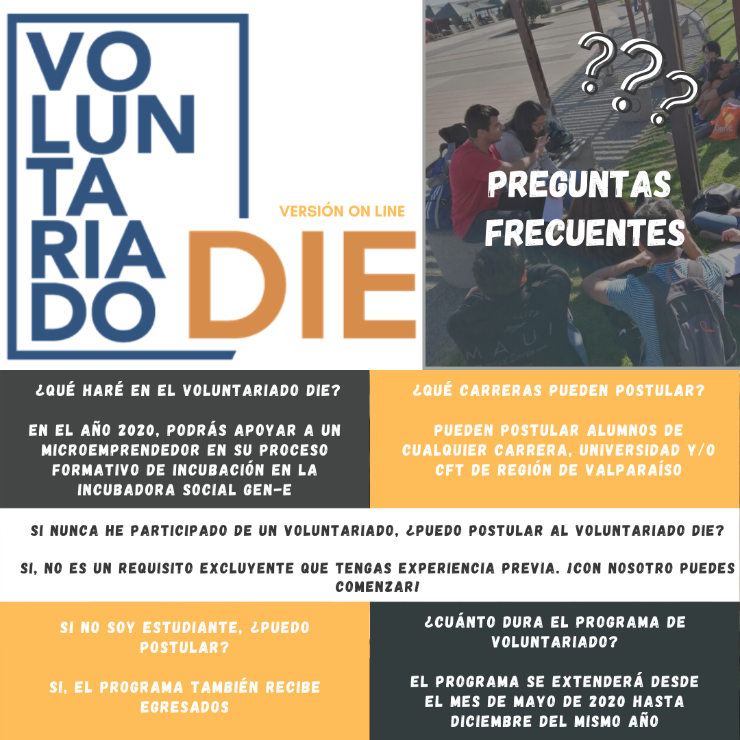 El Voluntariado DIE PUCV, busca ser un espacio para que los estudiantes universitarios de la Región de Valparaíso, puedan colocar en práctica sus habilidades profesionales y también personales al servicio de otros, en este caso de los beneficiarios de algunos de los siguientes programas de la Dirección de Innovación y Emprendimiento: