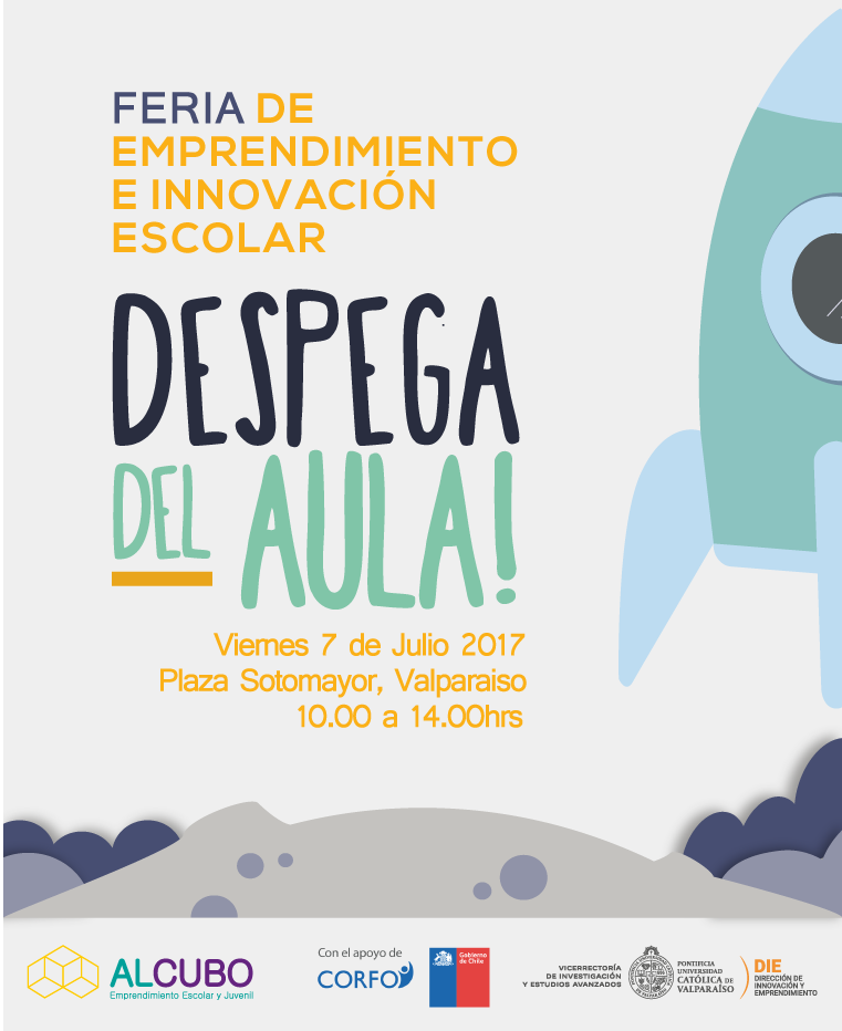 El proyecto Despega del Aula, ejecutado por AlCubo, Emprendimiento Escolar y Juvenil de la Dirección de Innovación y Emprendimiento PUCV, y co-financiado por CORFO, realizará la Feria de emprendimiento e innovación escolar, donde participarán establecimientos técnico-profesionales de tres provincias de la región, a través de sus prototipos de emprendimiento de alto impacto.