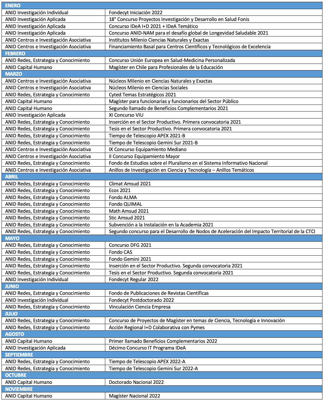 ANID entregó listado de sus convocatorias para el año 2021, junto a su correspondiente mes de apertura.