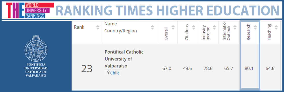 En el contexto Latinoamericano, la Pontificia Universidad Católica de Valparaíso (PUCV) ocupó el 23° lugar, manteniendo la posición del año anterior, siendo nuevamente el indicador vinculado a la investigación el de mayor ponderación.